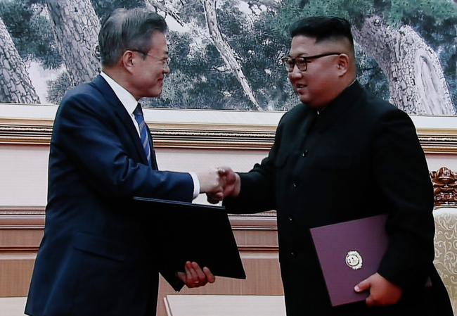 19일 오전 9월 평양공동선언문 서명식을 한 문재인 대통령과 김정은 북한 국무위원장의 악수하고 있다.