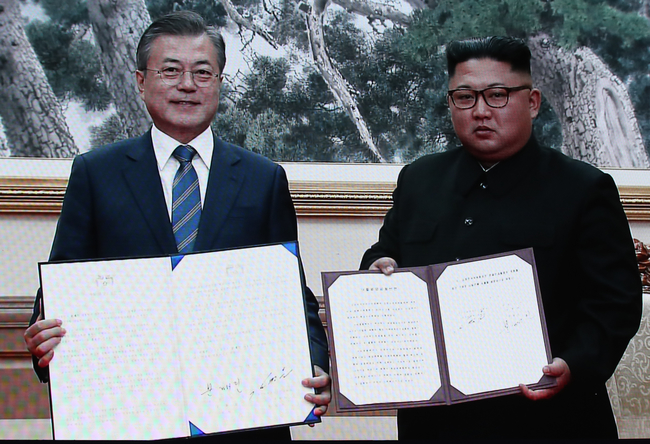 19일 오전 9월 평양공동선언문에 서명한 문재인 대통령과 김정은 북한 국무위원장이 기념촬영을 하고 있다.