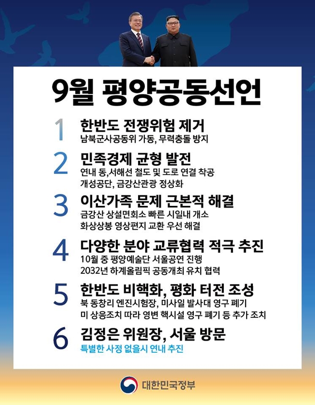 9월 평양공동선언의 주요 내용. 한반도 전쟁위험 제거, 민족경제 균형 발전, 이산가족 문제 근본적 해결, 다양한 분야 교류협력 적극 추진(예술단 공연, 하계올림픽 공동 유치 등), 한반도 비핵화 및 평화 터전 조성, 김정은 위원장 서울 방문