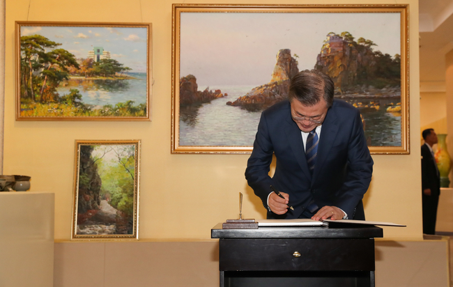 문재인 대통령이 19일 오후 평양 만수대창작사를 찾아 방명록에 글을 남기고 있다.