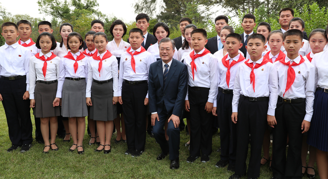 문재인 대통령이 19일 오후 남북정상회담 숙소로 사용한 평양 백화원초대소에 남쪽에서 가져온 10년생 모감주나무를 심은 뒤 행사에 참석한 학생들과 기념사진을 찍고 있다.