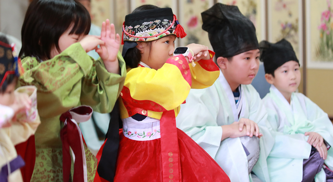 추석 명절 연휴 첫날인 22일 오전 서울 중구 남산공원 호현당에서 열린 '우리 것이 좋은 것이여' 프로그램에 참여한 어린이들이 전통 인사예절인 공수법과 우리 절을 익히고 있다.