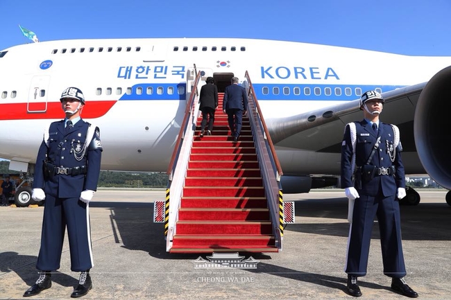 문재인 대통령과 부인 김정숙 여사가 제73차 유엔총회 참석차 23일 오후 경기도 성남 서울공항에서 공군 1호기에 탑승하고 있다.