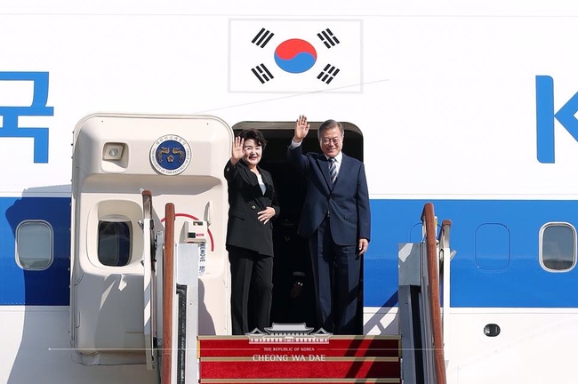 문재인 대통령과 부인 김정숙 여사가 제73차 유엔총회 참석차 23일 오후 경기도 성남 서울공항에서 공군 1호기에 탑승하고 있다.