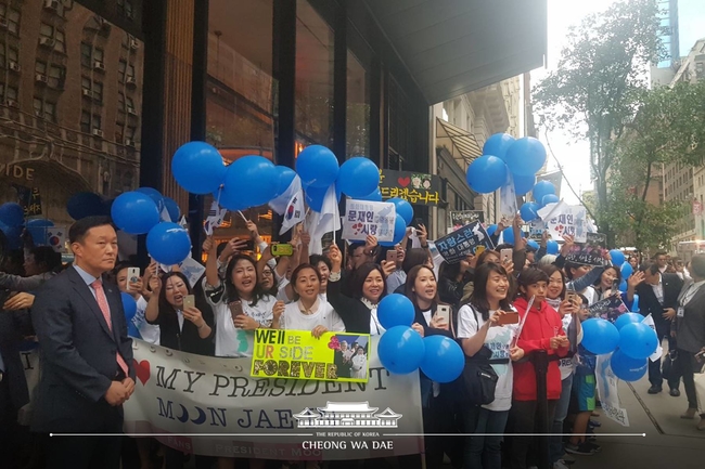 청와대가 미국 뉴욕에서 열린 73차 유엔총회에 참석한 문재인 대통령과 수행원들의 3일간의 생활을 스마트폰으로 찍은 'B컷'을 공개했다. 대통령 방문 첫날 부터 마지막 날까지, 숙소 앞에서 응원해 주던 뉴욕 교민들의 모습.