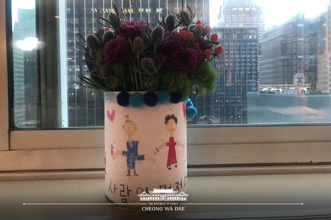 청와대가 미국 뉴욕에서 열린 73차 유엔총회에 참석한 문재인 대통령과 수행원들의 3일간의 생활을 스마트폰으로 찍은 'B컷'을 공개했다. 김정숙 여사가 호텔 앞에서 응원해주던 교민 자녀에게 받은 선물. 아이가 그린 화분과 예쁜 꽃. '사람이 먼저다'라는 글귀가 눈에 띈다.