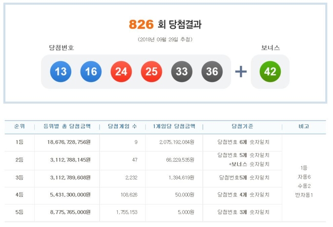 지난 29일 방송된 나눔로또 방송에 따르면 제826회 로또 1등 당첨번호는 13, 16, 24, 25, 33, 36로 결정됐다. 2등 보너스 번호는 42이다.