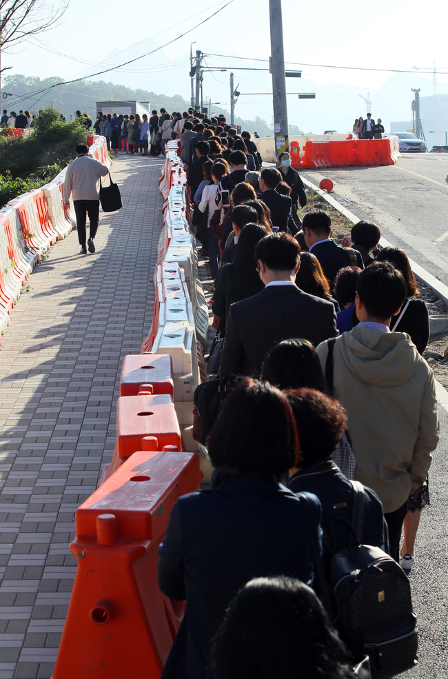 지하철 3호선 대화~구파발 구간의 양방향 운행이 중단된 2일 아침 경기 고양시 삼송역 인근 버스정류장에 서울로 출근하려는 시민들이 지하철 대신 버스를 타기 위해 길게 줄을 서고 있다.