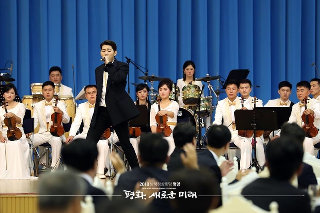 청와대가 2일 공식 페이스북을 통해 평양에서 열린 남북정상회담 첫날 만찬 공연 장면을 공개했다. '아티스트'를 부르는 지코.