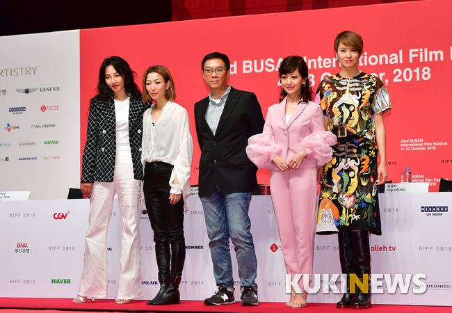 배우 바이바이허와 량융치, 정수문, 앤지 치우, 관금붕 감독이 5일 오후 부산 해운대 신세계백화점 문화홀에서 진행된 제23회 부산국제영화제 갈라 프레젠테이션 영화 '초연' 기자회견에 참석해 포토타임을 갖고 있다.
