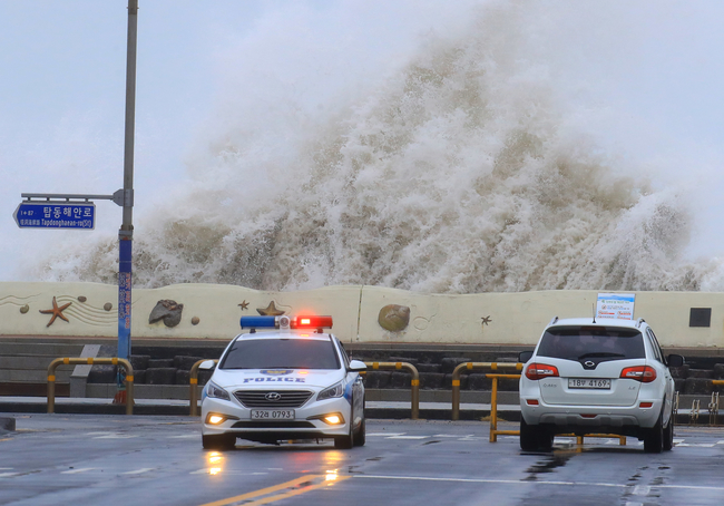 태풍 '콩레이'가 제주를 통과한 6일 오전 제주시 탑동 해안 방파제 위로 거대한 파도가 솟구쳐 올라오고 있다.