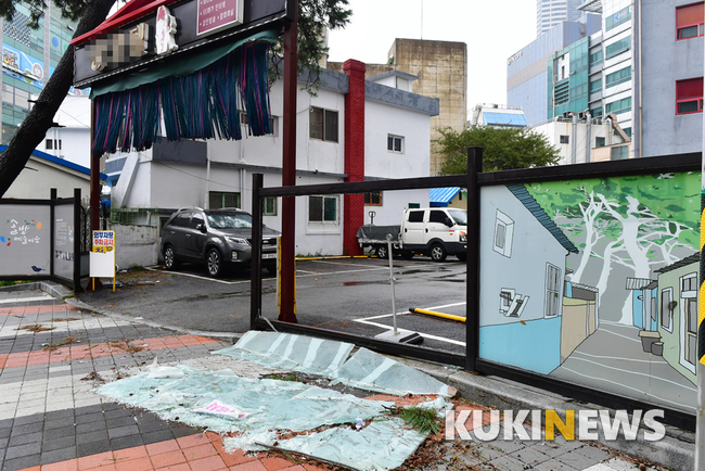 태풍 '콩레이'가 상륙한 6일 부산 해운대구 한 모텔 유리벽이 강풍으로 깨져있다.