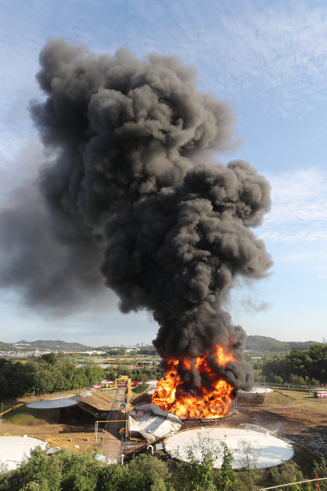 7일 경기도 고양시 덕양구 화전동 대한송유관공사 경인지사 저유소에서 불이 나 검은 연기와 불길이 치솟고 있다.