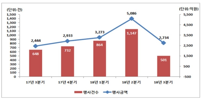 8일 한국예탁결제원에 따르면 3분기 예탁결제원을 통한 주식관련사채의 권리행사건수는 지난 2분기(1147건) 대비 56.3% 줄어든 501건으로 집계됐다. 권리행사금액을 기준으로 하면 같은 기간 46.2%(2734억원) 감소했다.