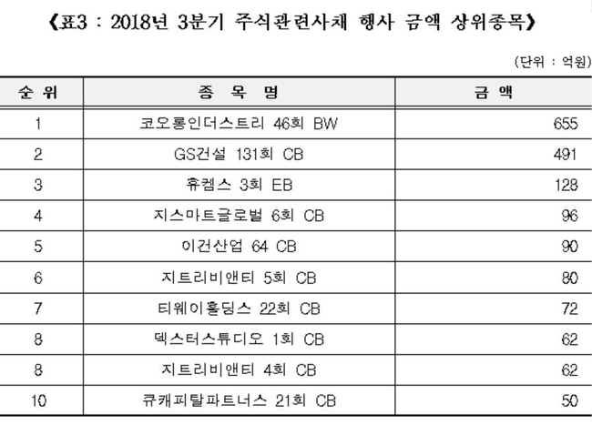 행사금액 상위종목에는 코오롱인더스트리 46회 BW가 655억원으로 가장 많았다. 이밖에 GS건설 131회 CB(491억), 휴켐스 3회 EB(128억) 순으로 나타났다.