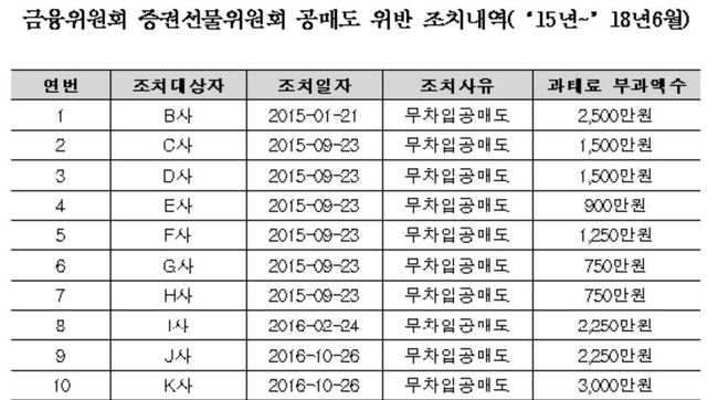 10일 금융위원회가 국회 정무위원회 소속 유의동 바른미래당 의원에게 제출한 공매도 위반 조치내역에 따르면 2015년부터 올해 상반기까지 19개 금융사의 불법 무차입 공매도 주식거래 총 과태로 규모는 3억9150만원으로 조사됐다. 건당 1630만원에 불과하다.