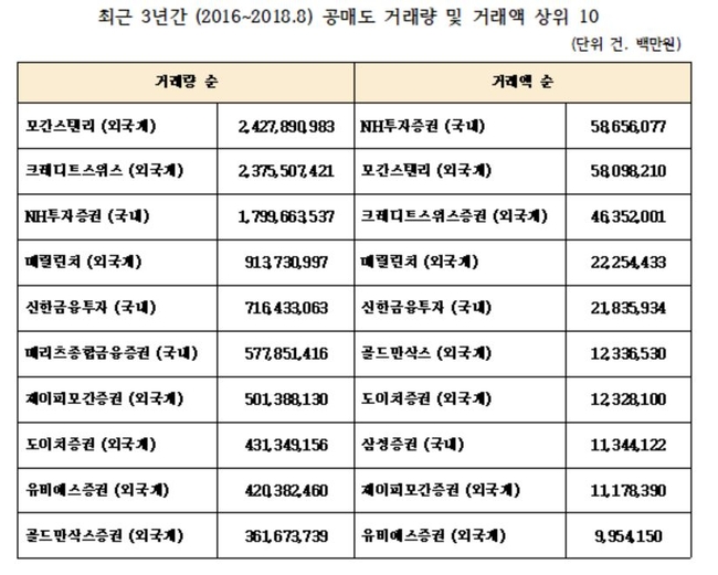 NH투자증권이 공매 거래액이 가장 많이 한 금융사로 나타났다. 거래량 기준으로는 외국계 증권사 모건스탠리다. 특히 올해 초 유령주식 사태를 일으켜 최고경영자(CEO)가 교체된 삼성증권도 상위 금융사에 이름을 올렸다. 당시 삼성증권 유령주식 사태로 공매도를 폐지 요청하는 청와대 청원이 진행되기도 했다.