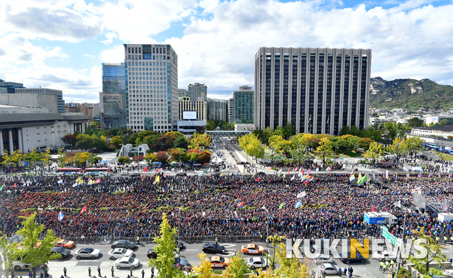 카카오의 카풀 서비스 도입을 반대하는 전국 택시 산업 종사자들이 18일 서울 광화문광장에서 열린 '택시 생존권 사수 결의대회'에서 구호를 외치고 있다.