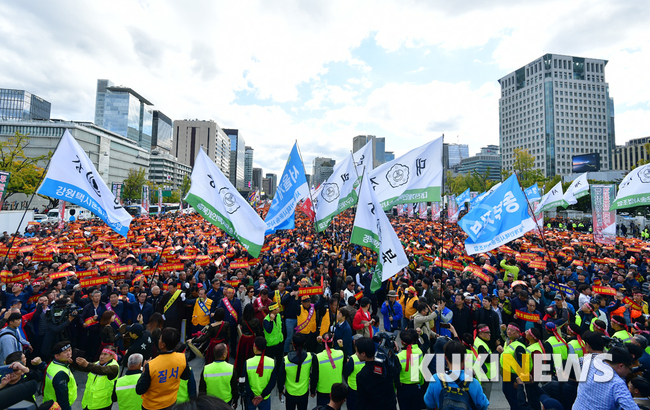 카카오의 카풀 서비스 도입을 반대하는 전국 택시 산업 종사자들이 18일 서울 광화문광장에서 열린 '택시 생존권 사수 결의대회'에서 구호를 외치고 있다.