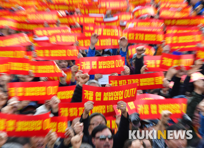 카카오의 카풀 서비스 도입을 반대하는 전국 택시 산업 종사자들이 18일 서울 광화문광장에서 열린 '택시 생존권 사수 결의대회'에서 구호를 외치고 있다.