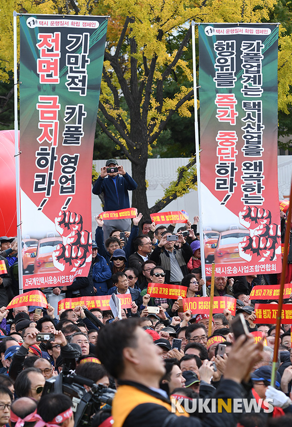 카카오의 카풀 서비스 도입을 반대하는 전국 택시 산업 종사자들이 18일 서울 광화문광장에서 열린 '택시 생존권 사수 결의대회'에서 구호를 외치고 있다.