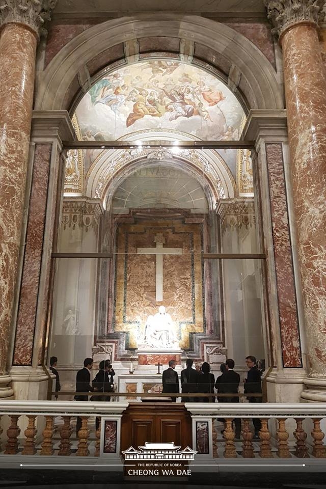 청와대가 22일 공식 SNS를 통해 7박 9일간 유럽순방을 마치고 귀국한 문재인 대통령의 바티칸에서 덴마크까지 여정을 공개했다. 유리문 안에서 피에타를 관람하는 문 대통령.