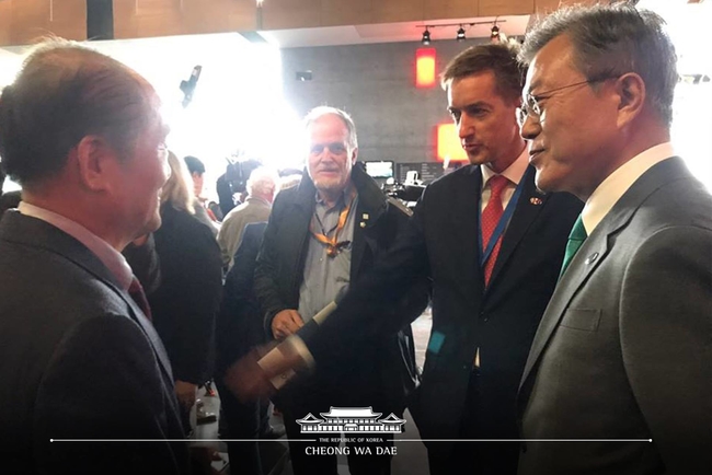 청와대가 22일 공식 SNS를 통해 7박9일간 유럽순방을 마치고 귀국한 문재인 대통령의 바티칸에서 덴마크까지 여정을 공개했다. 주 덴마크 대사, 덴마크 환경장관과 대화 나누는 문 대통령.