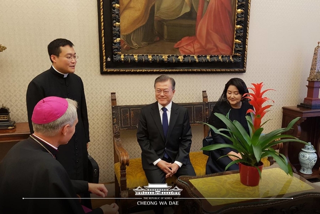 청와대가 22일 공식 SNS를 통해 7박9일간 유럽순방을 마치고 귀국한 문재인 대통령의 바티칸에서 덴마크까지 여정을 공개했다. 교황 알현을 위해 대기 중인 문 대통령 내외.