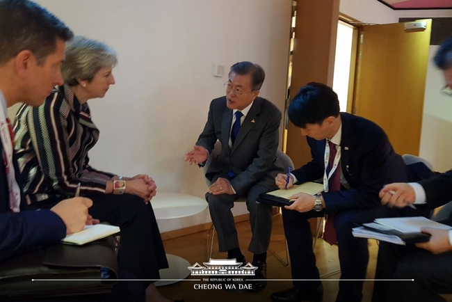 청와대가 22일 공식 SNS를 통해 7박9일간 유럽순방을 마치고 귀국한 문재인 대통령의 바티칸에서 덴마크까지 여정을 공개했다. ASEM 회의장에서 테레사 메이 영국총리를 만난 문 대통령.