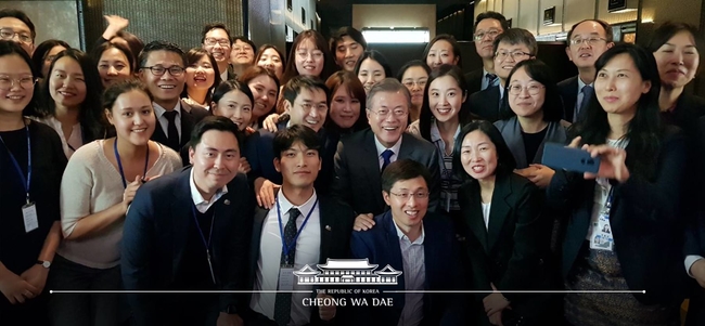 청와대가 22일 공식 SNS를 통해 7박9일간 유럽순방을 마치고 귀국한 문재인 대통령의 바티칸에서 덴마크까지 여정을 공개했다. ASEM 정상회담을 마치고 현지 외교부 직원들과 기념촬영.