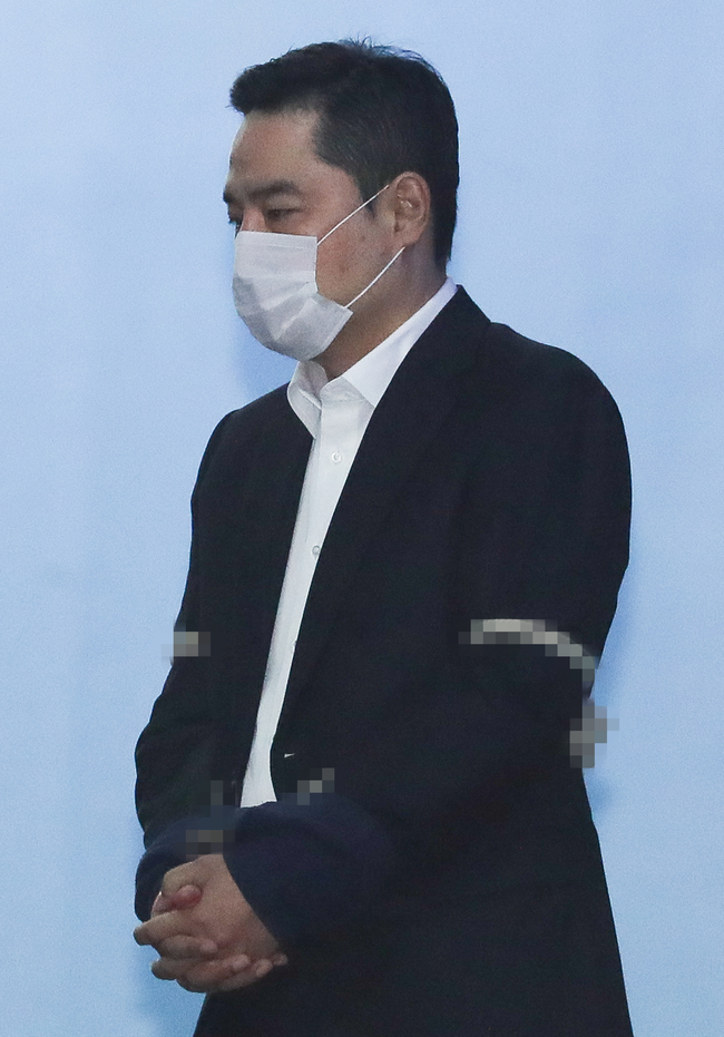 강용석 변호사가 24일 오후 서울 서초구 서울중앙지법에서 사문서 위조 혐의로 1심에서 징역 1년을 선고받고 법정구속되어 호송차로 향하고 있다.