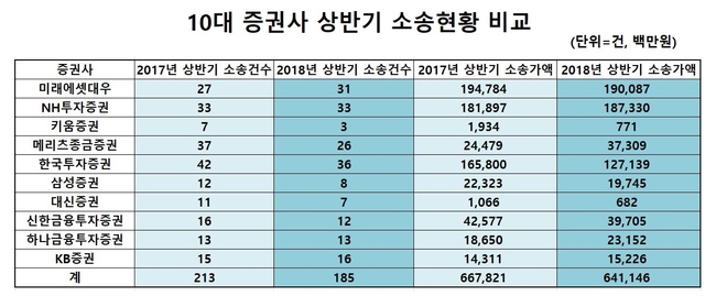 26일 금융감독원에 따르면 국내 10대 증권사의 올해 상반기 소송건수는 185건으로 집계됐다. 지난해 상반기 대비 28건(13.14%) 감소했다.