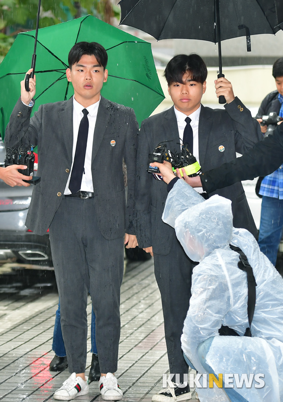 밴드 더 이스트라이트 멤버 이석철, 이승현 형제가 26일 오후 서울 방배경찰서에 폭행 피해 고소인 자격으로 출석해 취재진의 질문에 답하고 있다.