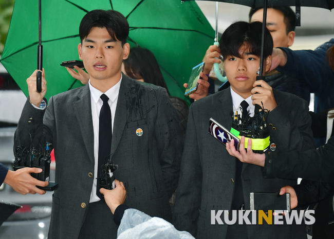 밴드 더 이스트라이트 멤버 이석철, 이승현 형제가 26일 오후 서울 방배경찰서에 폭행 피해 고소인 자격으로 출석해 취재진의 질문에 답하고 있다.