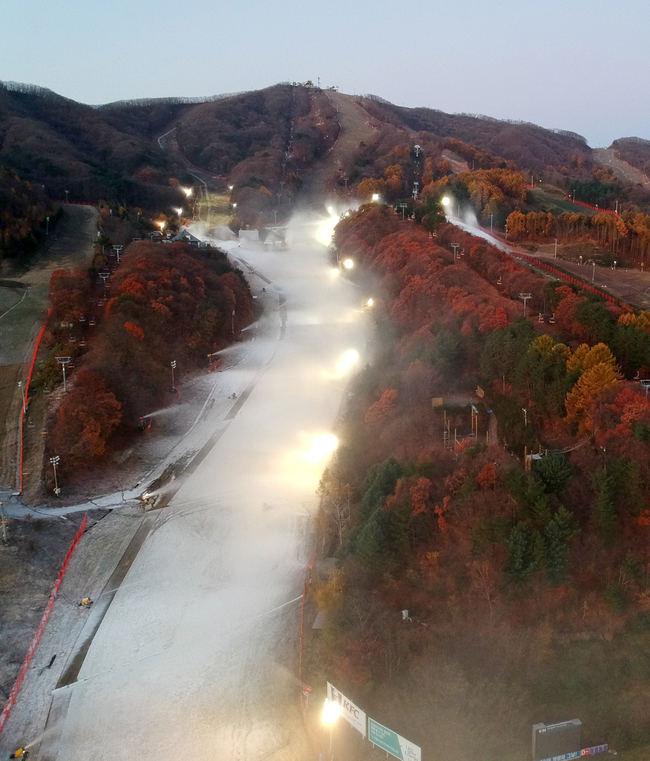 올가을 추위가 절정에 달한 30일 강원 평창군 휘닉스평창 스키장이 제설기를 가동해 인공눈을 만들면서 단풍 사이로 하얀 슬로프가 펼쳐져 있다.