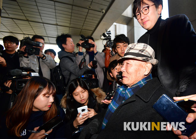 30일 오후 서울 서초구 대법원 앞에서 일제 강제징용 피해 생존자인 이춘식 할아버지가 강제징용 손해배상청구 소송 재상고심 판결을 위한 대법원 전원합의체가 열리는 대법정으로 들어서며 취재진의 질문에 답하고 있다.