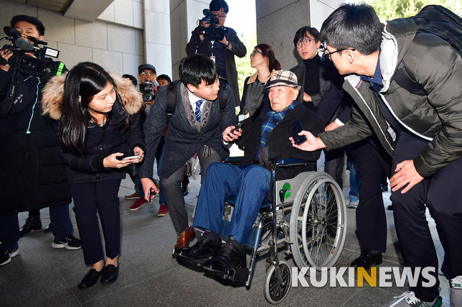 30일 서울 서초구 대법원 앞에서 일제 강제징용 피해자 이춘식 할아버지가 법정으로 향하고 있다. 이날 대법원 전원합의체는 이춘식씨(94) 등 일제 강제징용 피해자 4명이 신일본제철(현 신일철주금)을 상대로 낸 손해배상 청구소송에 대한 판결을 내릴 예정이다.