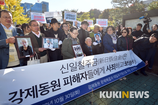 30일 서울 서초구 대법원 앞에서 일제 강제징용 피해자 이춘식 할아버지가 정문으로 행진하고 있다. 이날 대법원 전원합의체는 이춘식 옹(94) 등 일제 강제징용 피해자 4명이 신일본제철(현 신일철주금)을 상대로 낸 손해배상 청구소송에 대한 판결을 내릴 예정이다.