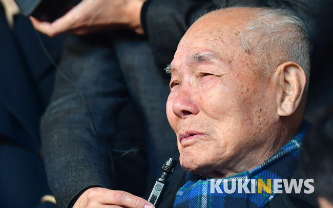 일제 강제징용 피해자 이춘식 할아버지가 30일 오후 서울 서초구 대법원에서 취재진의 질문에 승소 소감을 말하고 있다.
