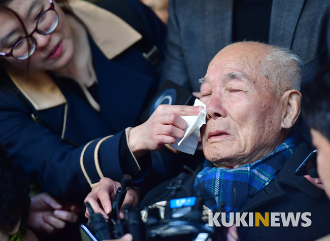 일제 강제징용 피해자 이춘식 할아버지가 30일 오후 서울 서초구 대법원에서 취재진의 질문에 승소 소감을 말하고 있다.