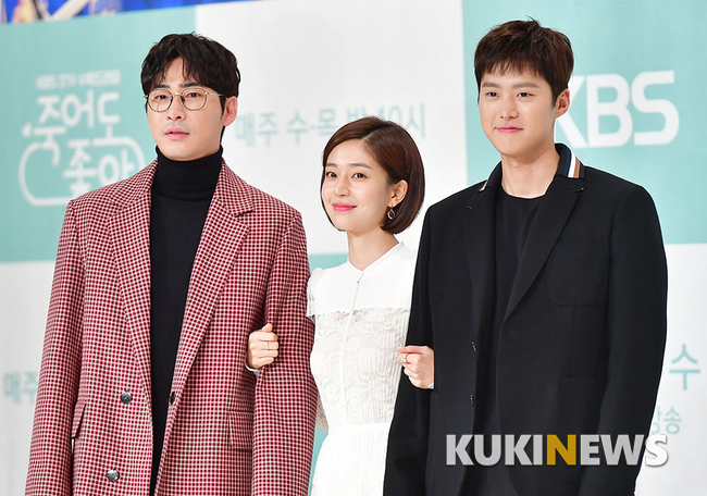 배우 강지환과 백진희, 공명이 5일 오후 서울 영등포 타임스퀘어 아모리스홀에서 열린 KBS 2TV 수목드라마 '죽어도 좋아' 제작발표회에 참석해 포즈를 취하고 있다.