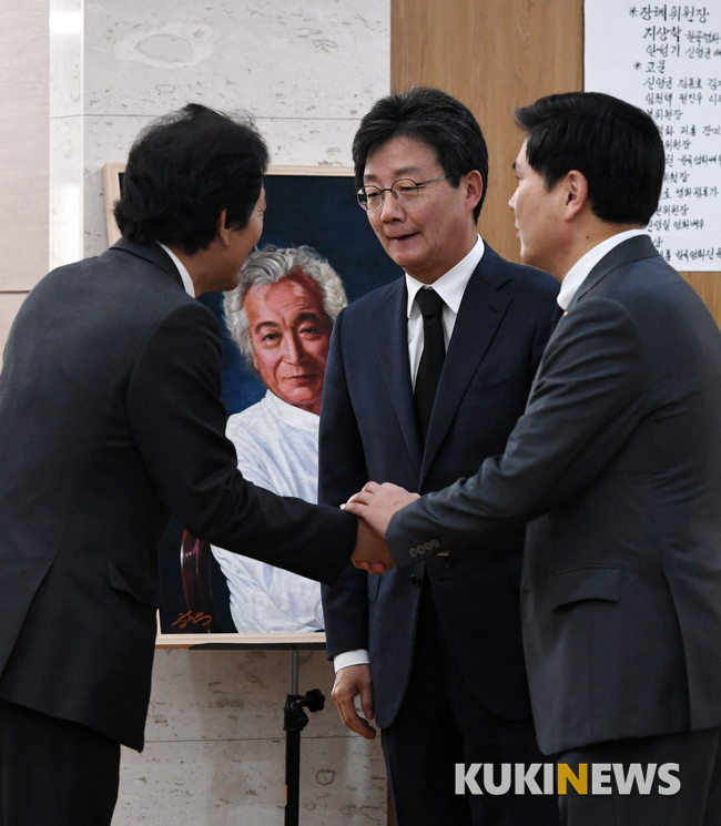 바른미래당 유승민, 지상욱 의원이 5일 오후 서울 송파구 풍납동 서울아산병원 장례식장에 마련된 故 신성일(81) 의 빈소에서 조문을 마치고 장례위원과 인사를 나누고 있다.