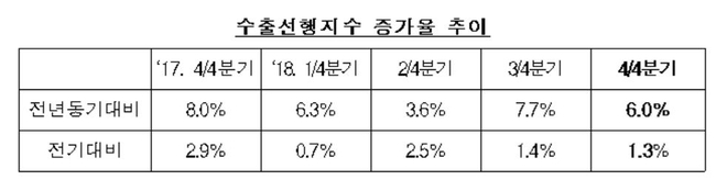 6일 수출입은행이 발표한 2018년 3분기 수출 실적 평가 및 4분기 전망에 따르면 향후 수출경기 판단의 기준이 되는 수출선행지수가 전년 동기 대비 상승하는 등 수출 증가세가 지속될 것으로 보인다.