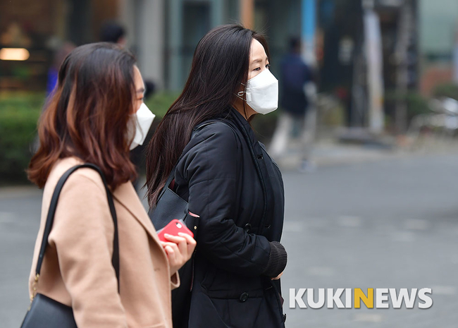 서울을 비롯한 수도권 미세먼지와 초미세먼지 농도가 '나쁨' 수준을 보인 7일 오전 서울 상암동에서 마스크를 쓴 시민들이 출근길을 서두르고 있다.