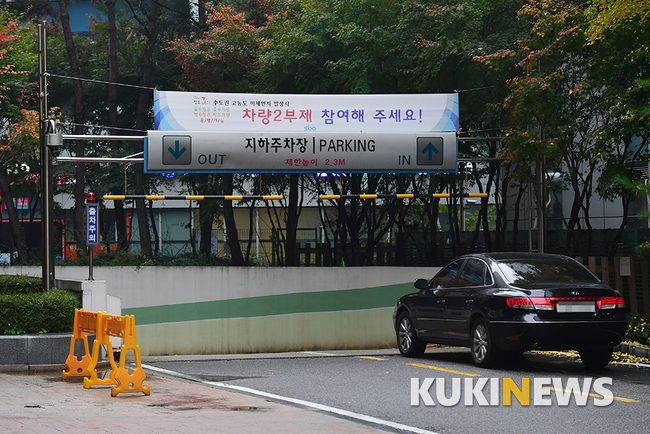 환경부가 수도권 지역에 미세먼지 비상저감조치를 발령한 7일 오전 서울 상암동 SBA 주차장 입구에 차량 2부제를 독려하는 현수막이 걸려있다.