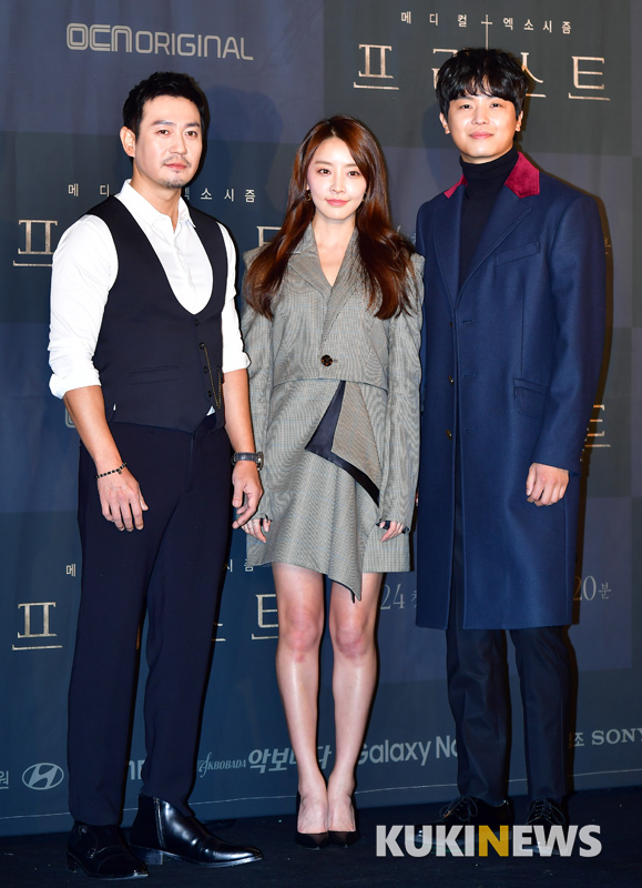 배우 박용우와 정유미, 연우진이 12일 오후 서울 영등포구 여의도동 콘래드서울호텔에서 열린 OCN 토일 오리지널 '프리스트' 제작발표회에 참석해 포토타임을 갖고 있다.