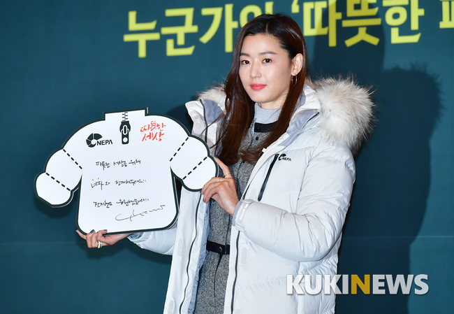 배우 전지현이 13일 오전 중구 소공동 웨스틴 조선호텔에서 열린 '네파 따뜻한 세상 캠페인 따뜻한 패딩 전달식'에 참석해 포즈를 취하고 있다.