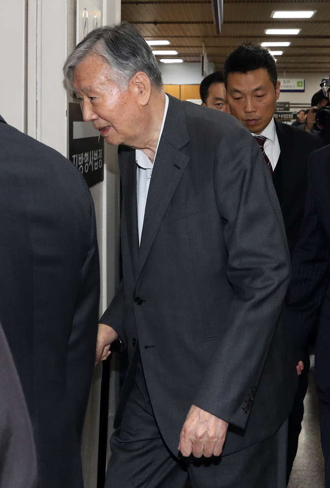 수천억 원대 횡령·배임과 임대주택 비리 혐의 등으로 재판에 넘겨진 이중근 부영그룹 회장이 13일 오후 서울 서초구 서울중앙지법에서 열린 1심 선고공판에 출석하며 법정으로 향하고 있다.