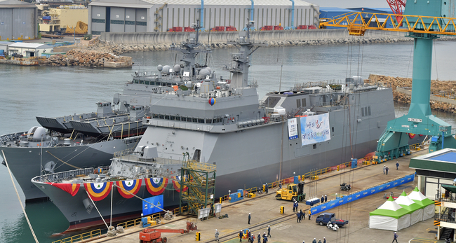 해군의 첫 훈련함인 한산도함(ATH-81)이 16일 울산 현대중공업 부두에 정박해있다. 왼쪽은 현대중공업에서 건조하고 있는 신형상륙함 노적봉함.