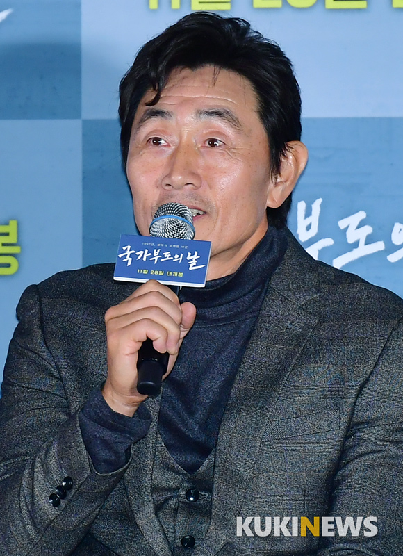 배우 허준호가 19일 오후 서울 CGV 용산에서 열린 영화 '국가부도의 날' 언론시사회에서 취재진의 질문에 답하고 있다.